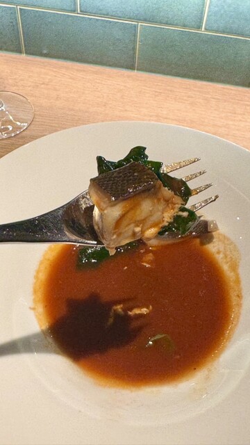 ふっくらとした石ダイに、魚介出汁とオマール海老の頭の旨味が凝縮したスープ。甲殻類の香ばしさが広がる、奥行きのある味わいの一皿。