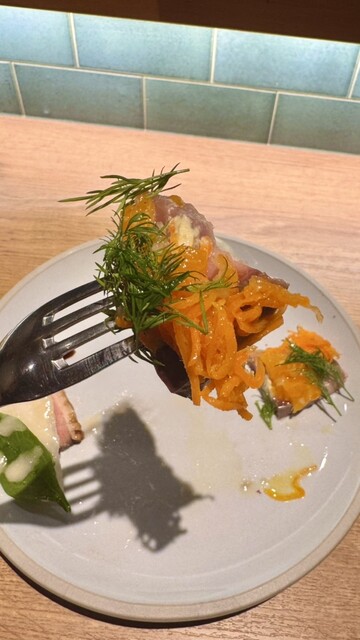 ほどよく燻した天然ぶりのコクに、冬人参の甘みとみかんの爽やかな酸味。仕上げに添えたディルの清涼感が全体を引き締め、燻香と柑橘が心地よく調和。
