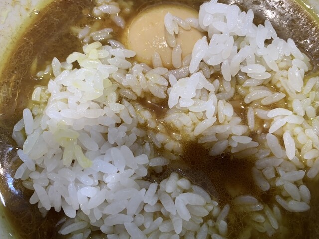 味玉最高〜前回も説明しましたが、奥にあるカレーを崩しながら食べると濃厚な風味に。このカレーの良いところは、カレーがそこまで辛く無いんですよね。ちゃんとカレーなんだけど、甘く無く、辛さもほど良い一番カレーの美味しさを追求しているように思います。そして醤油ラーメンなんだなぁ〜これは食べてください。食べてこの意味が初めてわかるはずです。そして、お店の方がほど良いタイミングでダイブ飯を。このダイブ飯はこだわりの鰹節が乗っております。で、どーんとダイブ。これも美味しいのよ!しかも、味玉ダブルの第二弾をダイブ飯と一緒に頂く〜至福の時間ですw しっかりと最後まで頂きました。