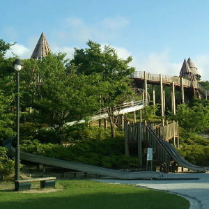 中でも日本海に向かって滑るような感覚が味わえる「ハヤブサスライダー」は子どもも大人も楽しめ遊具は回廊でつながっており車いすやベビーカーも一緒にまわることができるバリアフリー設計です。