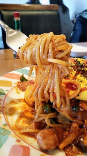 お店オススメのオムナポリタンは具沢山で見た目にボリューム満点な一品です。