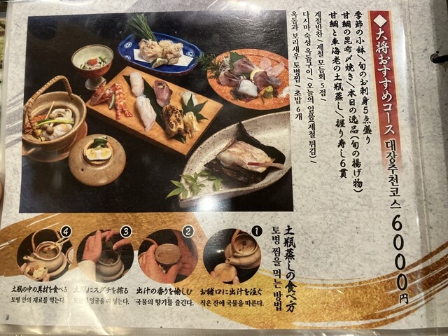 メニューは日本語と韓国語が併記。おすすめとか一品ずつ頼むか、にぎり寿司と何かにするか、いろいろと食べたかったし、今回は「大将おすすめコース」にする。