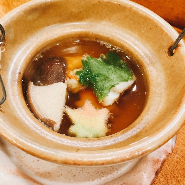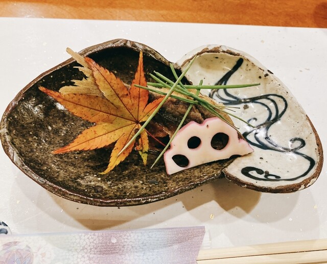 →お皿に紅葉が添えてあったり、見て食べてワクワクする感じ、あじは身が柔らかく、初っ端で先付けとして申し分ない。