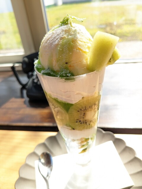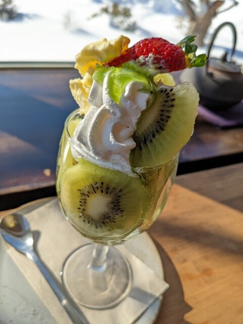 前のキウイパフェとは見た目違うけど、キウイゴロゴロ生クリームたっぷり、キウイソースも美味しくて、非常にフルーツ、アイス、生クリームのバランスの良いパフェです。めっちゃ美味しい!!キウイ。そんな好きじゃないけど、ここのは好き。