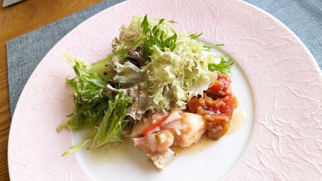 まずは前菜でサラダが出てきて、サラダも新鮮でうまいけど、添えてあるエスカベッシュ(これもオットに「何?」て聞かれたので「西洋風南蛮漬け」と答えました)がマジでうまい!もうこれだけで600円分くらいの満足感。盛り付けも美しいし、皿も私と夫で違うのでまた素敵。