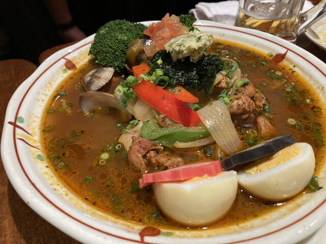具沢山で彩豊かなスープカレー、白子、やきそば、、