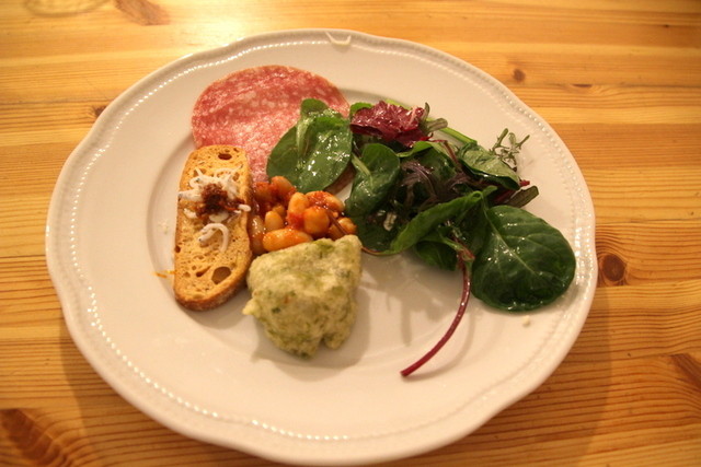 ・前菜…ルッコラ等のサラダ・ひよこ豆&大豆のトマト煮・青のりのフリッター&しらす乗せバケット・ソーセージの盛り合わせ!!\(^o^)/サラダにはお塩とオリーブオイル♡新鮮で甘いお塩&癖の無いオリーブオイルで(*^^)v豆のトマト煮もふっくら☆フリッターはモッチリ♡しらすバケットはアクセントに絡みの有るトマト煮が少量乗せて有りカリッカリのバケットと塩分多めのしらす(臭みなし)・ピリ辛トマト煮がバランス良し(^○^)ソーセージは普通でしたが全体に彩りバランス満足です(*^_^*)