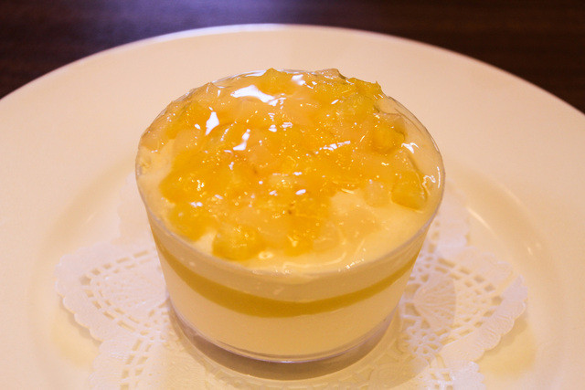 ・ムース・オ・フロマージュ…白ワイン入りのふんわり軽いレアチーズムースに白桃とパイナップルが飾られレモンゼリーが掛けられた一品!!(^。^)y-.。o○泡のように消えていレアチーズムースΣ(゚Д゚)こんなに軽いレアチーズケーキは初めて♪パイナップルと桃の甘さと食感でケーキを食べた感じが得られます(*^^)v
