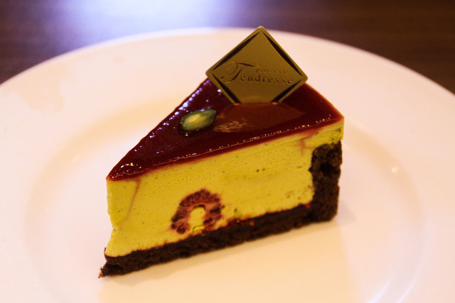 ・ディヴァン…フランボワーズ入りのピスターシュ(ピスタチオ)のババロアがショコラ味のビスキュイに乗せられ上にはフランボワーズジャム!!一粒飾られたピスターシュ♡緑と赤で彩もキレイ♪まったりコクのあるピスターシュババロアに甘酸っぱいフランボアーズは相性抜群☆滑らかで(*ノωノ)