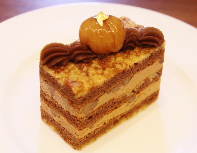 ・マロニエ…チョコ生地にマロンクリーム・マロンが重ねられ上にマロンペーストと栗の甘煮でデコレーション♪金粉でちょっぴりゴージャス感!!(#^^#)コクのあるチョコ生地でラム酒が良く効いています\(◎o◎)/!マロンとラム酒・チョコの組み合わせはテッパンですが滑らかなマロンクリームとパサついているのではないですがちょっと粗いチョコ生地とのバランスが素晴らしい!!ヾ(≧▽≦)ノ