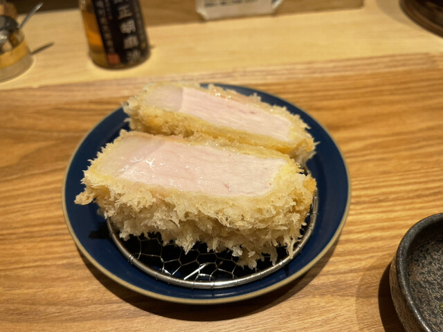 まずはバラを、おすすめされた柚子胡椒がよく合います。その後は特ロースとシャ豚ブリアン、厚切りのカツはレアな感じですが程よく火が通っていて美味しい、岩塩やソースでいただきます。