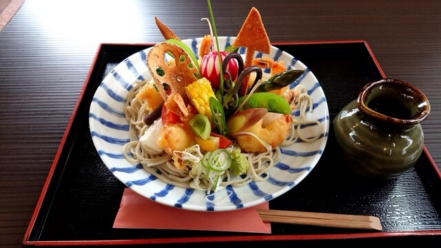 久々の渋やです。あげもちと海老天のそばを頼みました。値段は1800円だったような、ちょっと高いなと思いましたが、懐に多少余裕があったので期待して頼みました。30分くらい待ったでしょうか、目の前に到着。見たこともないソバでした。見た目華やか、手間が掛かっているなぁって印象。味はソバをメインで食べる私には今イチですが、ビジュアル重視の方にはよろしいかと・・・。私的には具がメインで、蕎麦が脇役になっている印象を受けました。食感はおもしろかったです。