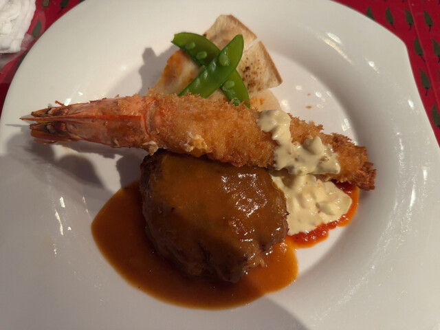 自分はハンバーグとクリームコロッケのセット、連れはハンバーグと海老フライを注文!