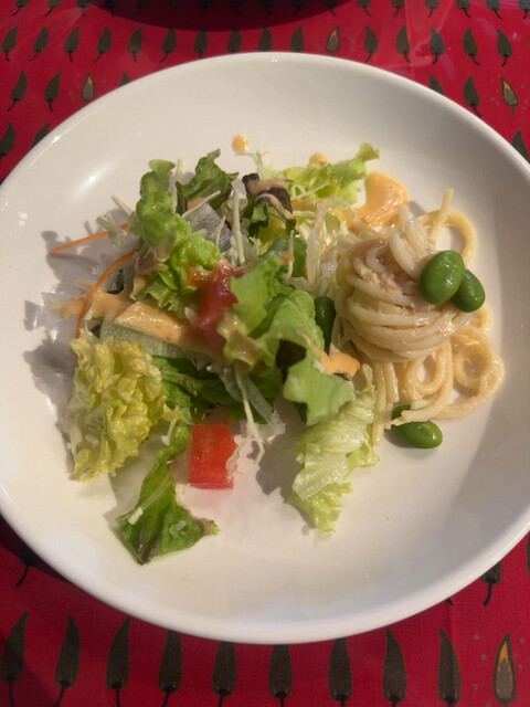 レタス、パプリカなど数種類が混ざったサラダに一口サイズのパスタ、どちらも美味しい♪