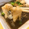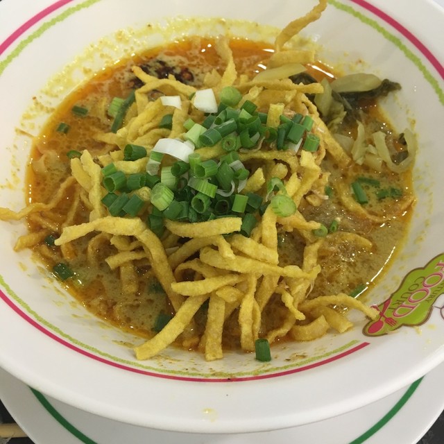 カレー麺のこと。上に乗ってる揚げ麺がパリパリしてる!味は日本風。麺は平打ち。中華麺だったのかな??