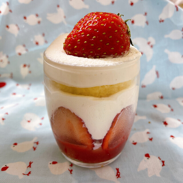 美しいグラススイーツ。中にはいちご、スポンジ、カスタードなど。