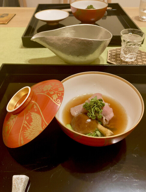 先付け。葛豆腐だったかな…つくしと菜の花。桜の葉に包まれた鯛の一口鮨。百合根を色付けして桜の花びらのように。