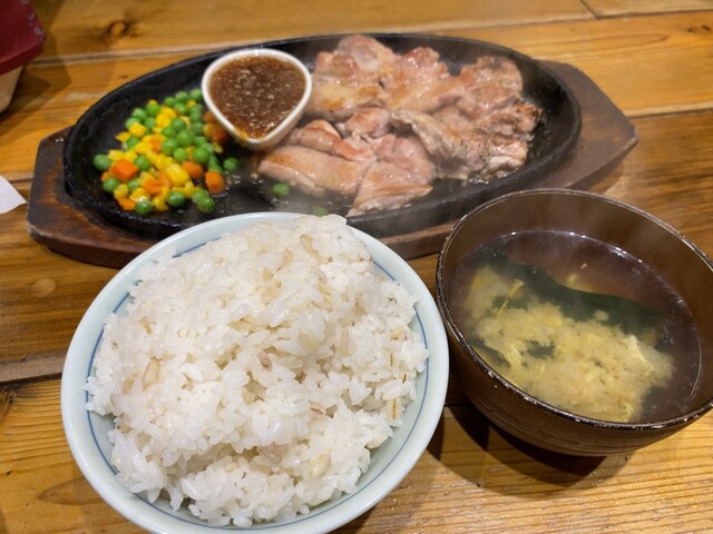 自分が入店した時点でまだ誰にも料理が提供されていなかったので、ちょっと時間が掛かるだろうなと考え、この投稿を書きながら料理の到着を待つ・・・と思ったら、先客5名分を追い抜いて自分のお料理が一番に届いた。先客のほとんどはハンバーグ。成型したり火を入れるのに時間が掛かるハンバーグに比べると、やはりチキンステーキはスピーディーだ。