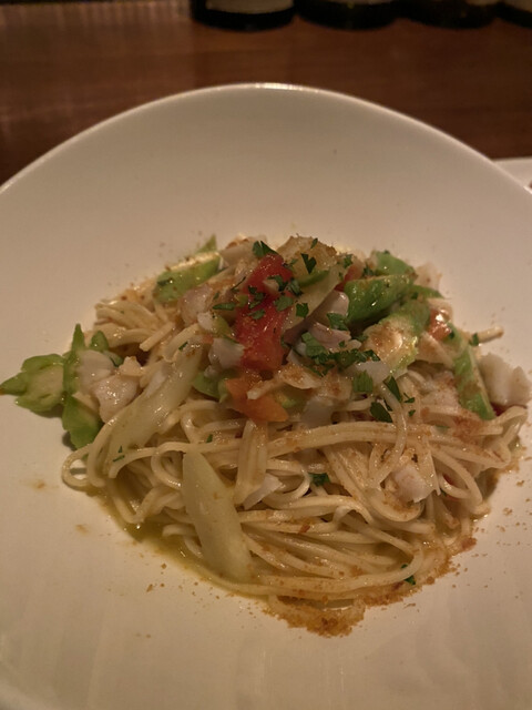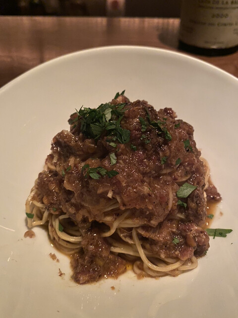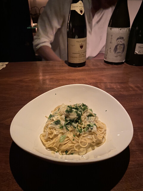 土曜日の深夜、三軒目の利用で伺った。パスタ一品、白ワインと赤ワインを一杯ずつ。しっかりディナーをいただくこともできるし、ナイトキャップ的な使い方もできる、そんな便利なお店である。