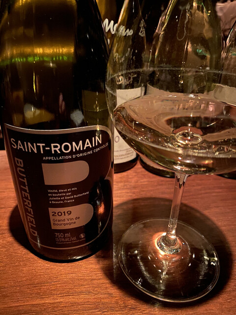 ◯グラスで白ワイン、バターフィールドのブルゴーニュ・レヴォー2023年。AOCブルゴーニュとは思えないクオリティの高さ。