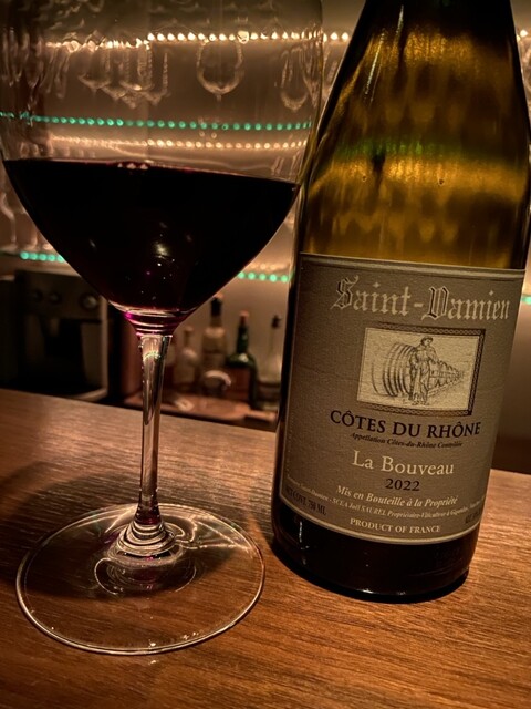 飲み物は、グラスでシャンパン(プティジャン・ピエンヌ ブラン・ド・ブラン・レゼルヴ)、ボトルでロアーニャのランゲ・ソレア2015年、最後にグラスで赤ワイン(サン・ダミアン コート・デュ・ローヌ・ラ・ブーヴォー2022年)