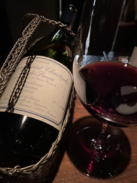 飲み物は、グラスでシャンパン(フランソワ・オルバンのブリュット・レゼルヴ)、グラスで白ワイン(ヴァルジェのサン・ヴェラン・リュー (アンテル) ディ2022年)、ボトルで赤ワイン(プリウレ・サン・クリストフのヴァン・ド・サヴォワ・ルージュ・モンドゥーズ・トラディシオン2006年)。