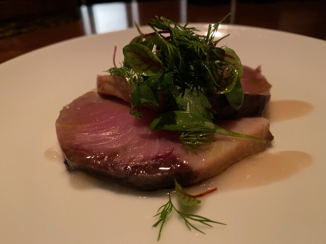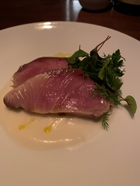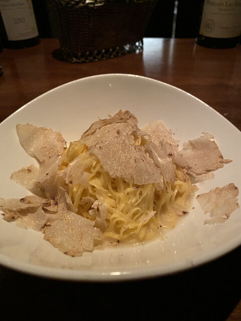 この日は、前菜に寒鰤の片面を炙ったものを。パスタはこの時期のスペシャリテであるタヤリン、白トリュフをたっぷりと振りかけてもらったのだが、なかなかいい香りであった。お肉はジビエ、山うずらを頂いた。内臓をコニャックで煮込んだ軽めのソース。丸々一羽だったのでなかなかの食べ応え。