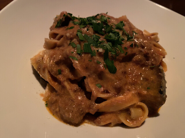 一通り食べて呑んだ後の〆に伺ったので、フードはタリアテッレだけ。雲丹の軽いトマトクリームソースのもの。クリームを余り使うことがないシェフのお料理の中ではクリーム多めのお料理。