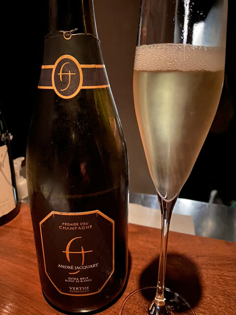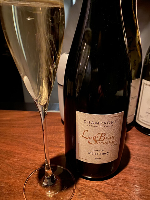 シャンパンはグラスでブリュン・セルヴネイのメロデ・アン・セー。ボトルワインはドメーヌ・セレスティンのジュヴレ・シャンベルタン・ヴィエイユ・ヴィーニュ2000年。セレスティンを飲みたいと事前にお願いしておいたら、「地味な生産者だし〜」といいながらもちゃんとお持ちであったところがさすが。
