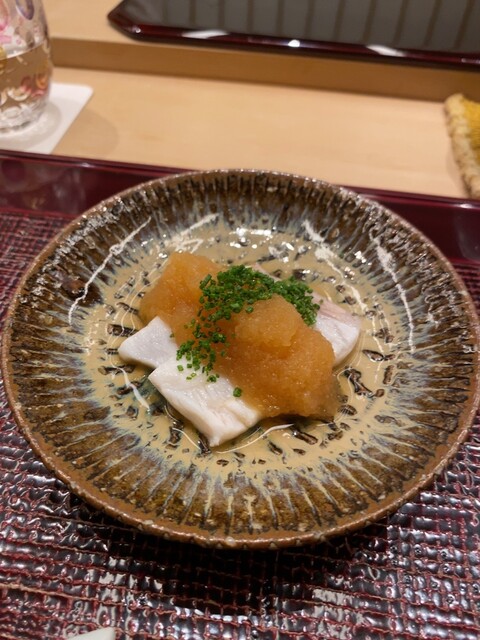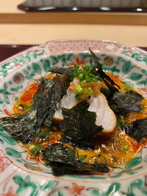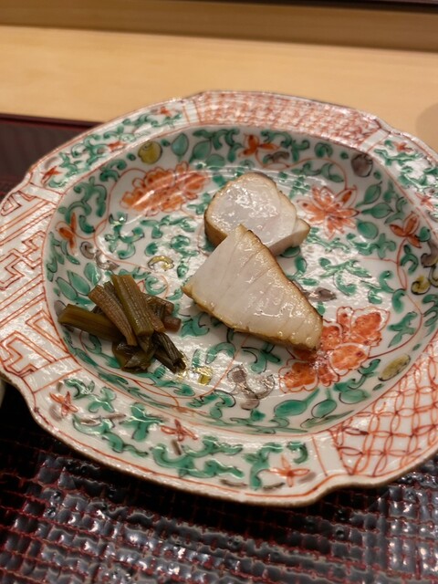 お摘みは菊菜のお浸しからスタート。お摘みのなかで白眉だったのはカワハギ。カワハギの身にちょこんと肝を乗せたものは何度もいただいたことごあるが、たっぷりの肝をカワハギの身で包むという逆転型は始めての体験。いつものサワラ、黒アワビなどはもちろん美味だったし、加賀蓮根の摺流しに浮かぶ蒸した白甘鯛も絶品。