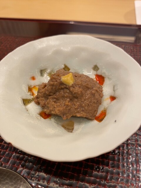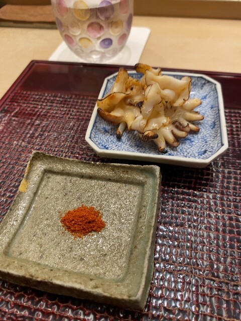 ◯スペシャリテのホタルイカのペースト。辛子が絶妙。すぐには食べ切らず、握りに入っても日本酒でチビチビと続ける。