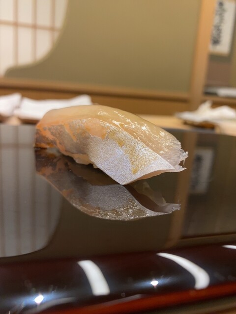 握りの白眉は白甘鯛。塩〆。数年前にも一度出していただいたことがあるが、そのときと同じく鮮烈な印象を与えてくれる。塩だけだと言うのに凄い旨味である。