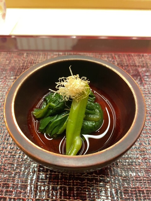 土曜日の午後6時半、2名で伺った。遂にミシュラン三つ星を獲得されたので本当にたくさんの胡蝶蘭が部屋中に。親方の後ろにあった盆栽はなんとあの三輪休雪さんからのお祝いとのこと、改めて青空さんの凄さを認識。