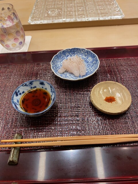 ②大将である青空さん、職人意識が高いのはもちろんですが、その美意識の高さにも感心させられます。時代物と現代物とがバランスよく使われる食器群、さりげなく飾られている美しい絵画などもそうですが、ビシッと決まった髪型、独特な形の襟元、シャープな体つきなど、あらゆる面において美意識が高いと思わされます。エンターテイナーではないですが、だからと言ってとっつきにくいことはなく、キチンとした距離感を保ちつつ、適度に快適な会話を楽しませてくれる方です。