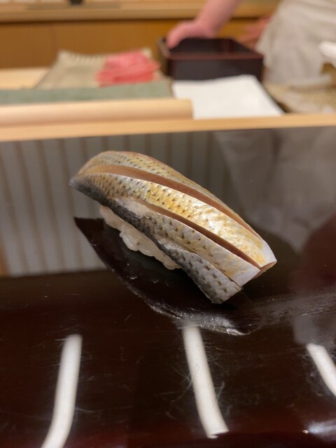 握りは白甘鯛の塩〆から始まったのだが、先月と同様で、凝縮した旨味が凄まじい。そのほかにも、この日はアジ、シマアジ、ブリなどが特に良かった。