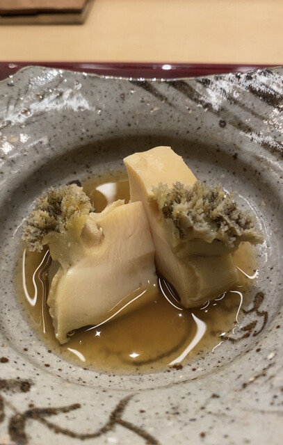 まずは銀杏からスタート、次いで毛蟹のお料理、その後、鱧出汁で火を入れた七種のキノコのお料理、鱧の焼き霜(とても脂がのっていた)、サンマの焼き物(肝醤油ソース掛け)と続く。お造りは珍しく一種類だけだったが、とはいえ濃厚でネットリとした極上のマツカワガレイ。そしてお得意の黒鮑(常磐)、鰹のタタキ(エシャレットのおろしがとても良かった・・・匂わないニンニクのよう)、焼き物は珍しいことにシシャモ。