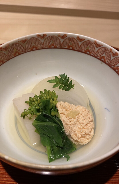 この日の白眉は実はいきなりの一品目、聖護院蕪の擦り流し。そのなかにフグの白子と自家製カラスミのパウダー。蕪の擦り流しとはいえ、お水とお塩だけで仕上げていて、実にシャープで綺麗なお味で、それゆえに白子とカラスミの味の濃さが却って引き立つという感じであった。