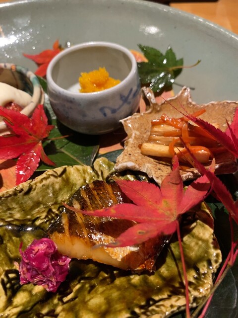 器だけ写真を撮って肝心のお料理の写真を撮り忘れたが、一品目は徳島の甘鯛の養老蒸し。山芋の摺流しを蒸しあげたものを養老蒸しというらしい。鯛の出汁などからとった餡のような出汁が掛けられていて、そのお味が上品ながらしっかり濃厚。