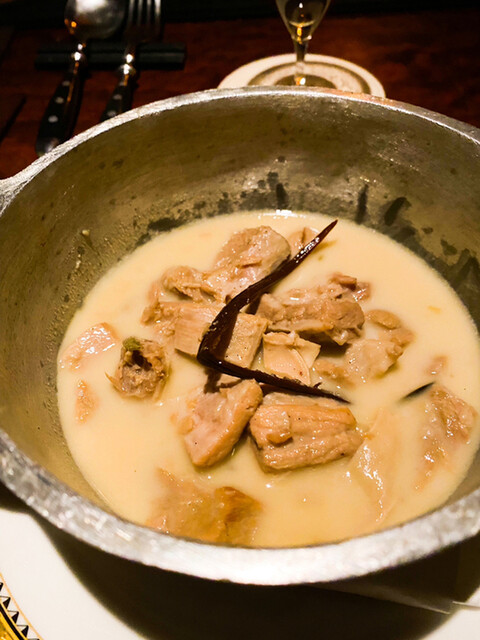 この日は日本橋にある肉友謹製の「仔牛のブランケット」なるお料理を頂いた。こちらのお店のオーナーさんがレユニオン(だったかな?)で買ってきたバニラを使って。