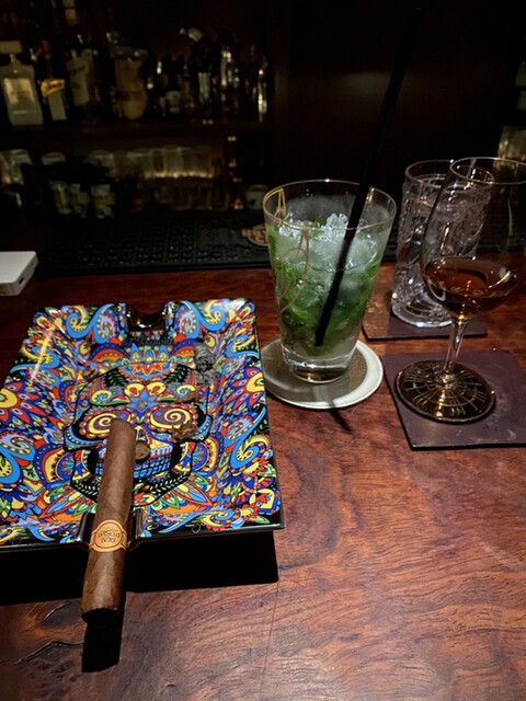 この日は新富町でイノベーティブ・フュージョン的なお料理を頂いた後での訪問。ラムのドクターペッパー割りをチェイサーにして、ラム数杯とシガーを頂いた。