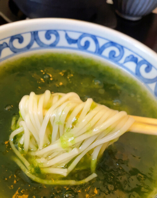 さて、お盆に乗せられてお料理が到着。ビジュアルからしていかにも「あおさ」。まさに碧である。濃くて美しい碧。「あおさ」をたっぷり含んだ餡が掛けられていて、箸で麺を引き上げようとするとトロッというかドロっとした粘り強さ。鼻腔をくすぐる「あおさ」の薫りが実に芳しく、どこかの海の岩場にいるみたいな錯覚に陥る。