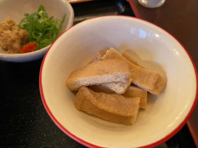 5分ほどして比較的大きなお盆が到着。薬味は九条ネギのようなネギ、生姜をすりおろしたようなもの、そして唐辛子ペーストのようなもの。すり鉢に入った胡麻。そして胡麻油。揚げ煮は別皿で。また味変用にということで小皿も付属。