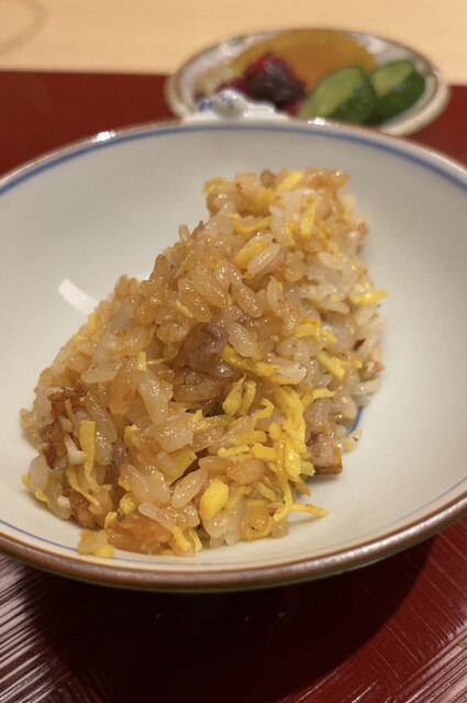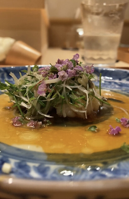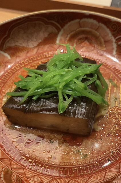 久我山時代からお使いの乾山写しの器に入ってきたものはスペシャリテのノドグロの飯蒸し。ただしいつもとは少し様相が異なり、香味野菜を乗せて香味油を掛けて中華風に仕立てたもの。実はインスタでどなたかが「矢萩ナイト」で出されたこのお料理を投稿されていたのを見ていて、矢萩さんにリクエストしたらお応え下さったという次第。久我山時代に中華の山口祐介さん(銀座シックスのJASMINE和心漢菜(現在は閉店)のシェフをしていた方で現在は浙江省・天台山にある星野リゾートの中華レストランの総料理長)と大将とがコラボした際に出されたお料理を矢萩さんなりに再構築したもの。これは本当に美味しかった。