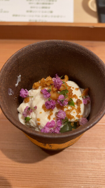 ◯お造り二品目はカツオ。これがこの日の白眉であった。皮目を軽く炙って。掛けられていたソースは納豆をベースにしたもので、納豆の臭みはまったくないものの、納豆の香り、そして仄かな甘みのあるもの。