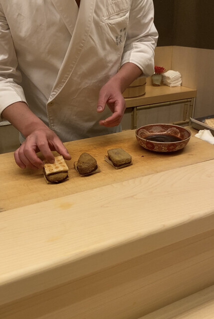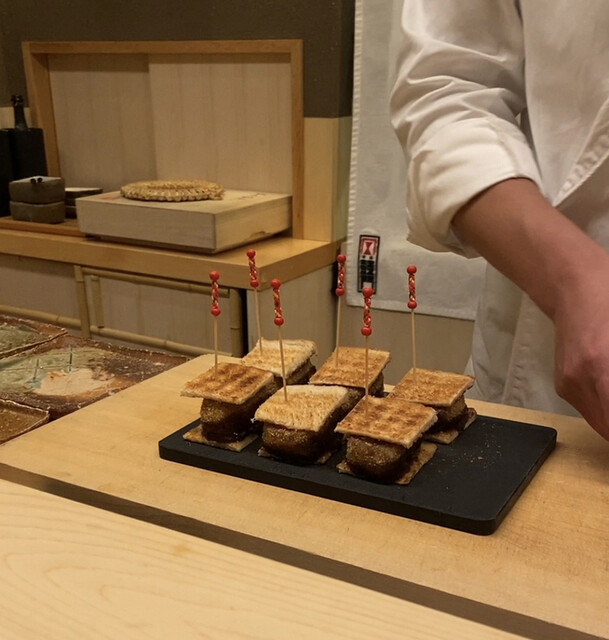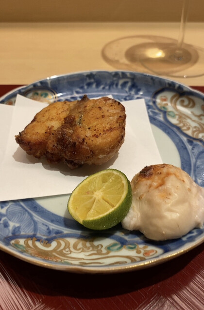 銀座に移転されてからは、久我山時代に比べると、銀座の場所柄や客層を意識してなのか、そのヤンチャぶりは少し鳴りを潜めた印象だが、定番のノドグロ飯蒸しは相変わらず絶品だったし、ビーフカツサンドやフィレ・オ・フィッシュで楽しませることは忘れないし、鮑の飛竜頭をフューチャーしたお椀や久世茄子と穴子を中心に構成された炊き合わせは実に正統な日本料理然としていて、様々な顔を覗かせるという魅力は以前のままであった。