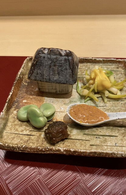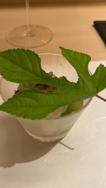 コの字型のカウンター(10名席)と奥の個室1つ(4名席)という作りで、比較的こじんまりとした印象。器楽亭時代とは異なり、女将さんは着物、ソムリエさんはスーツを着てのサービス。お値段は以前からは値上げして、2025年4月時点では税込約38,500円、お料理や内装はもちろんのこと、サービス面でもお値段に見合ったものを目指しておいでなのであろう。