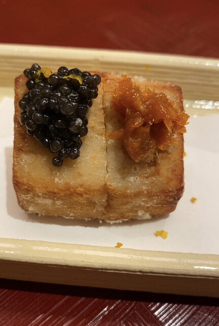 この1年間にまた少し進化しておられた。まずはグリーンアスパラの香煎揚げからスタートする。小さなバーガー袋に入れられたアスパラを手で受け取り、頬張る。熱々で美味しい。春雨サラダという名で提供された一品は太めの春雨と名残りの花山椒とたっぷりのキャビアを混ぜ混ぜしていただくという贅沢なもの。