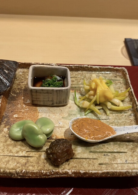◯八寸:①コノワタと菜の花、②タラの芽のフライ、③バチコ、④タコの旨煮、⑤ホタルイカ、⑥蕗の薹の佃煮、⑦塩辛、⑧カラスミ餅の磯辺焼き