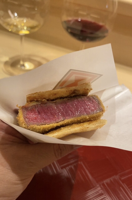 ◯こちらのお店の(蒸し寿司と並ぶ)スペシャリテといえばビーフカツサンド。この日のお客さんは常連さんばかりで食べ飽きているだろうからと言うことで、この日はメンチカツサンド。気が利いている。黒毛和牛と松茸で作られたメンチカツ、キャベツの千切り、スライスしたチーズ。