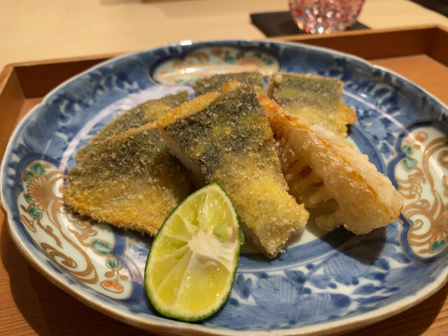 ◯焼き物&揚げ物(マナガツオの幽庵焼き、トウモロコシのフライ。薬味の柚子おろしが爽やかでとても良かった)